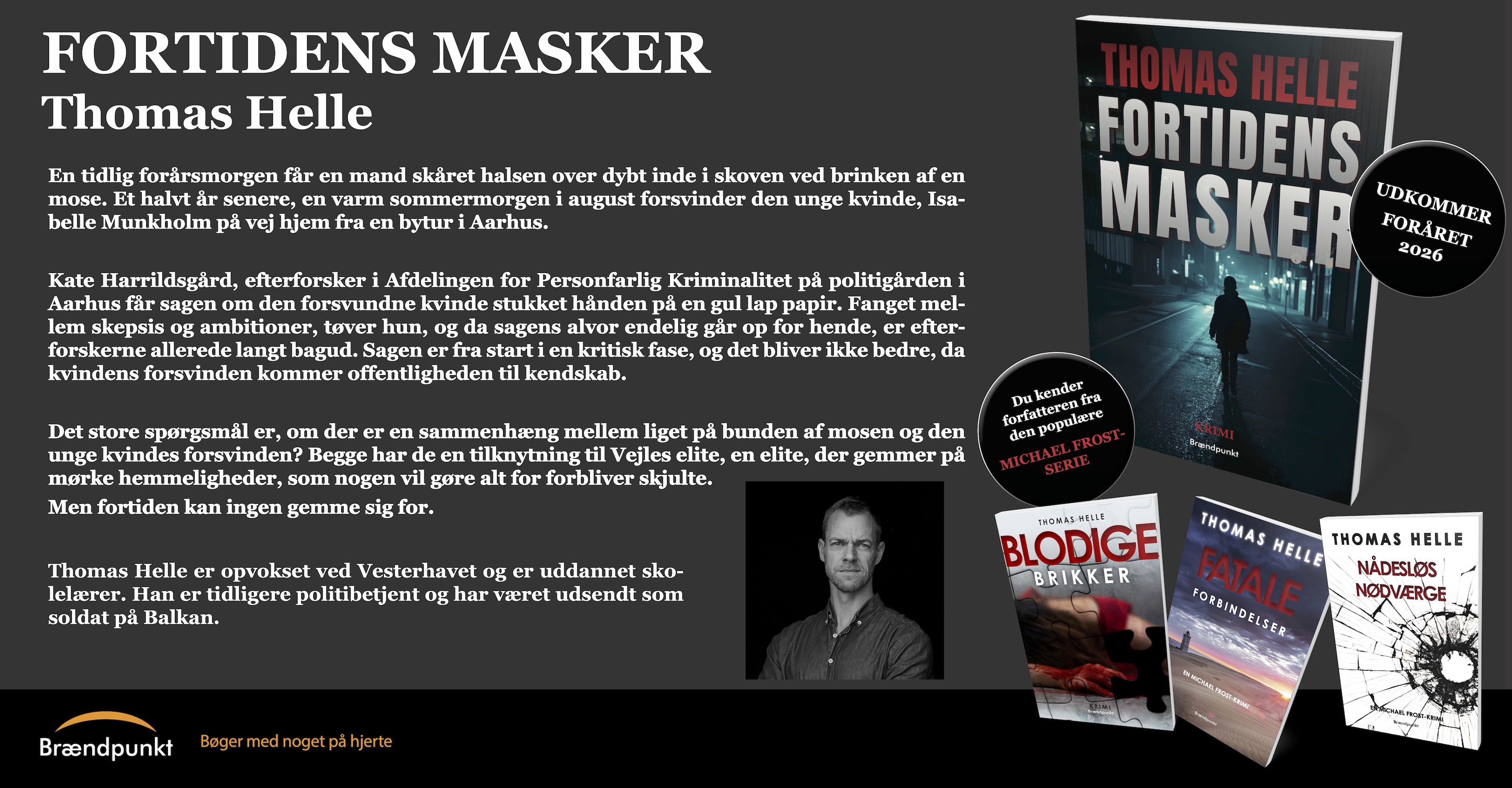 1. Maj 2026 udkommer krimien FORTIDENS MASKER af Thomas Helle Magt, hemmeligheder og en forbrydelse, der rækker ind i Folketinget FORTIDENS MASKER er en intens og mørk spændingsroman om forsvinding,