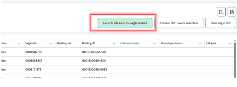 Vælg “Generér FIK-kode for valgte faktura her: