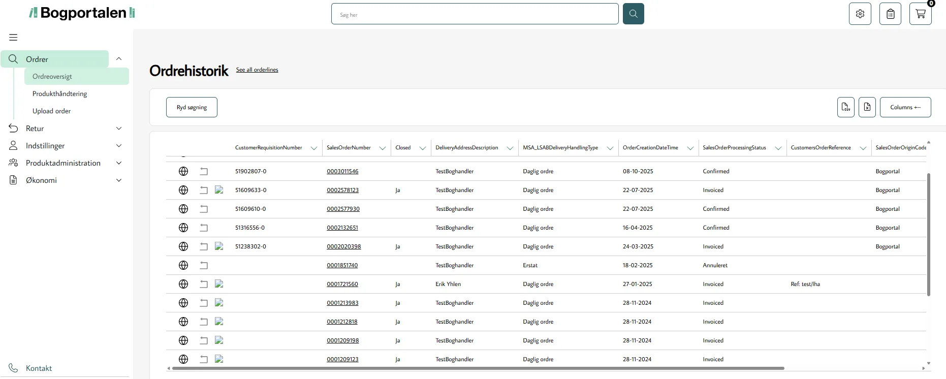 - Her kan du se dine ordrelinjer samt filtrere på ordrehistorikken ved at vælge de kolonner, du ønsker i visningen (se hvordan i følgende skærmbilleder).