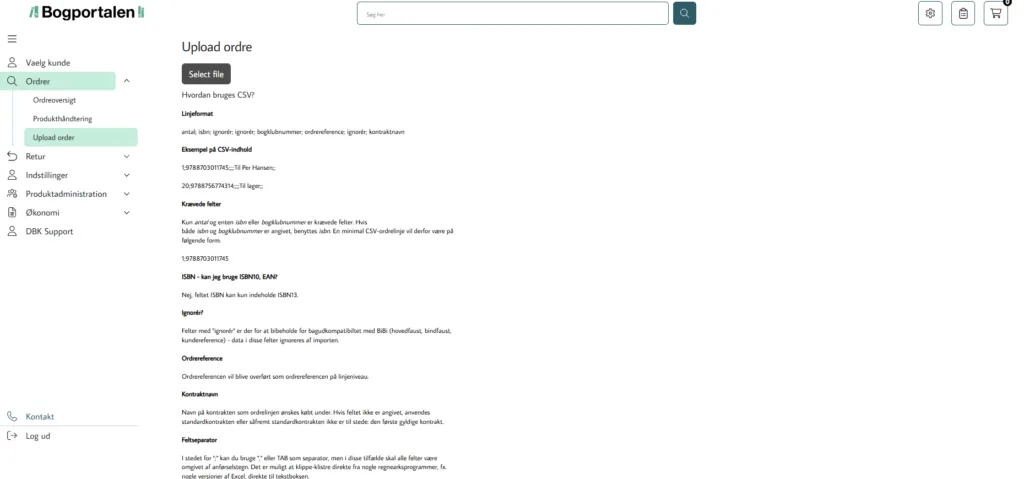 For at kunne uploade en ordrefil til Bogportalen skal filen være oprettet i det korrekte format (CSV) og indeholde en række obligatoriske felter.